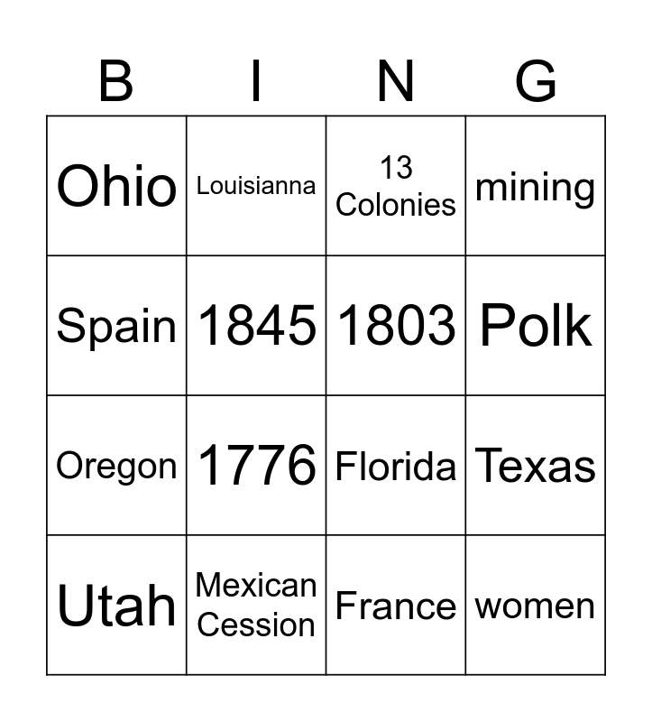 This bingo card has 16 words: Mexican Cession, Texas, 13 Colonies, Ohio, Oregon, Louisianna, Florida, France, Spain, 1845, Utah, mining, 1776, Polk, 1803 and women.