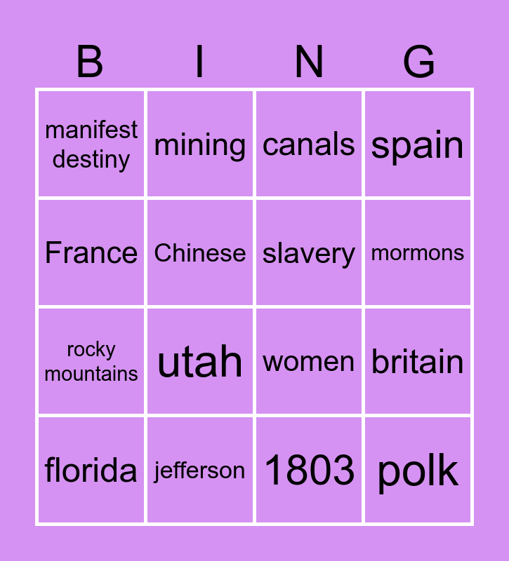 This bingo card has 16 words: jefferson, britain, canals, manifest destiny, rocky mountains, mining, women, 1803, France, Chinese, florida, spain, utah, mormons, slavery and polk.