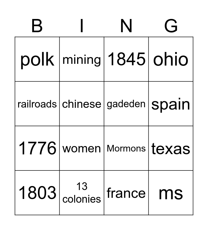 This bingo card has 16 words: 13 colonies, texas, 1845, polk, 1776, mining, Mormons, france, railroads, chinese, 1803, ohio, women, spain, gadeden and ms.