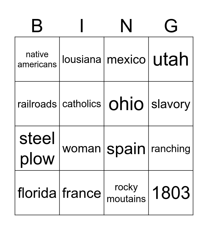This bingo card has 16 words: florida, france, mexico, utah, railroads, lousiana, spain, ranching, native americans, catholics, rocky moutains, slavory, steel plow, woman, ohio and 1803.