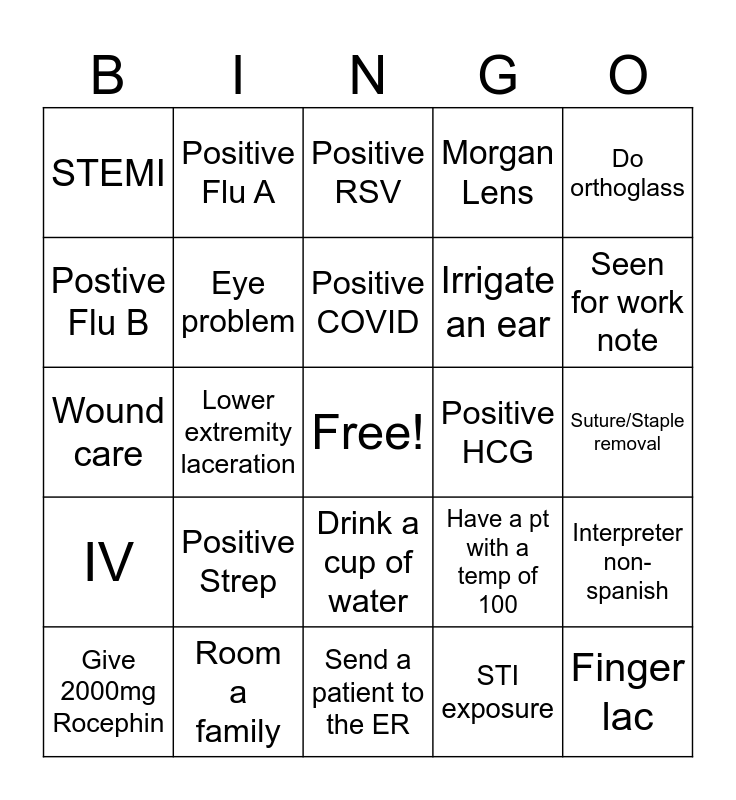 This bingo card has a free space and 24 words: Positive Strep, Room a family, Positive COVID, Give 2000mg Rocephin, Do orthoglass, STEMI, Postive Flu B, Positive Flu A, Positive HCG, Drink a cup of water, Irrigate an ear, Wound care, Have a pt with a temp of 100, Interpreter non-spanish, Eye problem, STI exposure, Suture/Staple removal, Positive RSV, Seen for work note, Lower extremity laceration, Finger lac, IV, Morgan Lens and Send a patient to the ER.