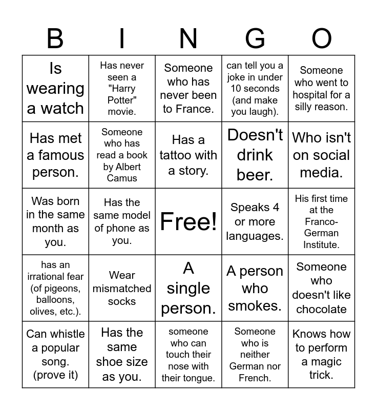 This bingo card has a free space and 24 words: Wear mismatched socks, Has the same shoe size as you., Has a tattoo with a story., Can whistle a popular song. (prove it), Someone who went to hospital for a silly reason., Is wearing a watch, Has met a famous person., Has never seen a "Harry Potter" movie., Speaks 4 or more languages., A single person., Doesn't drink beer., Was born in the same month as you., A person who smokes., Someone who doesn't like chocolate, Someone who has read a book by Albert Camus, Someone who is neither German nor French., His first time at the Franco-German Institute., Someone who has never been to France., Who isn't on social media., Has the same model of phone as you., Knows how to perform a magic trick., has an irrational fear (of pigeons, balloons, olives, etc.)., can tell you a joke in under 10 seconds (and make you laugh). and someone who can touch their nose with their tongue..