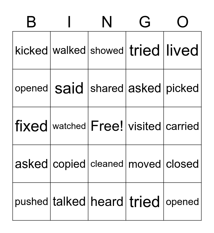 This bingo card has a free space and 72 words: played, walked, watched, liked, loved, cried, tried, called, asked, answered, pushed, pulled, picked, kicked, dropped, fixed, moved, lived, studied, carried, copied, opened, closed, called, asked, started, wanted, needed, helped, looked, talked, jumped, danced, laughed, tried, studied, carried, listened, opened, closed, cleaned, washed, brushed, worked, called, asked, answered, climbed, followed, started, waited, wanted, needed, visited, painted, used, showed, shared, ran, drank, slept, had, began, heard, smiled, yelled, said, ate, wrote, went, saw and bought.