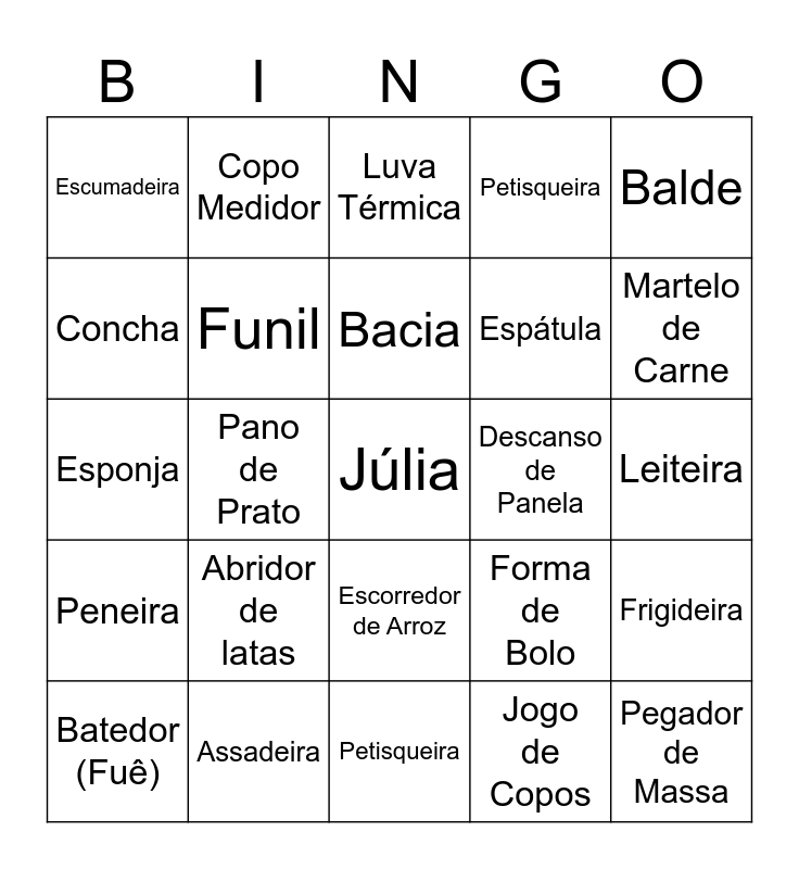 This bingo card has a free space and 24 words: Abridor de latas, Assadeira, Bacia, Batedor (Fuê), Balde, Escumadeira, Concha, Copo Medidor, Descanso de Panela, Escorredor de Arroz, Espátula, Esponja, Forma de Bolo, Frigideira, Funil, Jogo de Copos, Leiteira, Luva Térmica, Martelo de Carne, Pano de Prato, Pegador de Massa, Peneira, Petisqueira and Petisqueira.