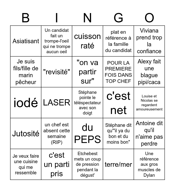 This bingo card has 25 words: Jutosité, c'est un parti pris, Stéphane pointe le téléspectateur avec son doigt, terre/mer, Viviana prend trop la confiance, Asiatisant, Un candidat fait un trompe-l'oeil qui ne trompe aucun oeil, cuisson raté, c'est net, Antoine dit qu'il n'aime pas perdre, Je suis fils/fille de marin pêcheur, "revisité", Etchebest mets un coup de pression pendant la dégust', Stéphane dit qu'"il ya du bon et du moins bon", Alexy fait une blague pipi/caca, Je veux faire une cuisine qui me ressemble, LASER, "on va partir sur", POUR LA PREMIERE FOIS DANS TOP CHEF, Louise et Nicolas se regardent amoureusement, iodé, un chef est absent cette semaine (RIP), du PEPS, plat en référence à la famille du candidat and Une référence aux gros muscles de Dylan.