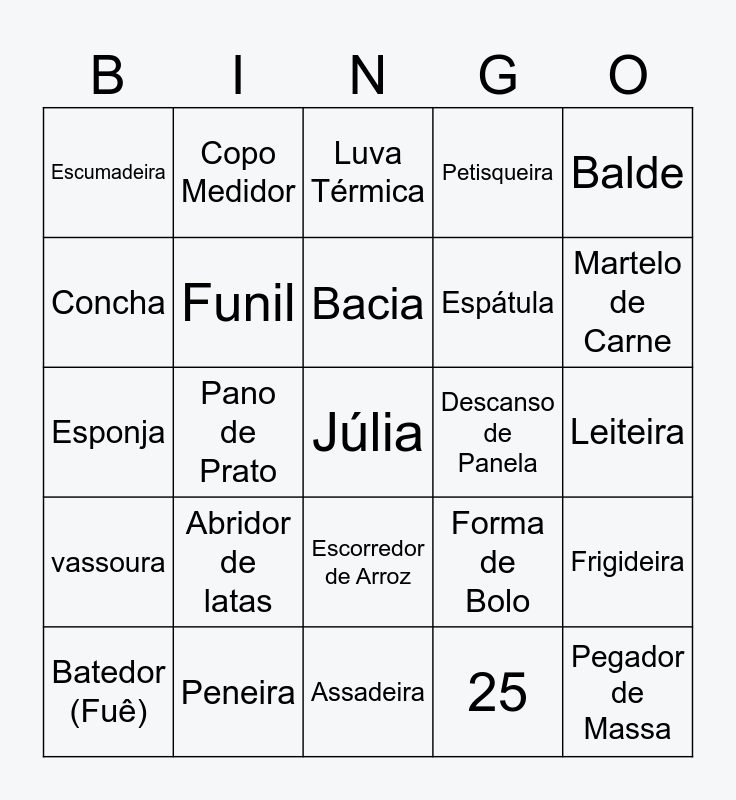 This bingo card has a free space and 25 words: Abridor de latas, Assadeira, Bacia, Batedor (Fuê), Balde, Escumadeira, Concha, Copo Medidor, Descanso de Panela, Escorredor de Arroz, Espátula, Esponja, Forma de Bolo, Frigideira, Funil, Jogo de Copos, Leiteira, Luva Térmica, Martelo de Carne, Pano de Prato, Pegador de Massa, Peneira, vassoura, Petisqueira and 25.