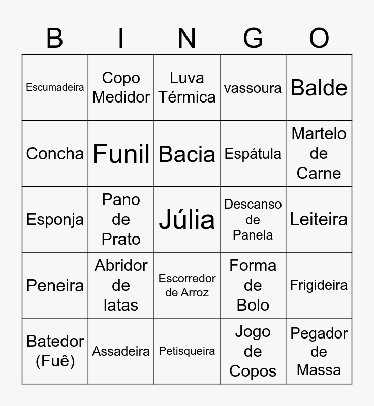 This bingo card has a free space and 24 words: Abridor de latas, Assadeira, Bacia, Batedor (Fuê), Balde, Escumadeira, Concha, Copo Medidor, Descanso de Panela, Escorredor de Arroz, Espátula, Esponja, Forma de Bolo, Frigideira, Funil, Jogo de Copos, Leiteira, Luva Térmica, Martelo de Carne, Pano de Prato, Pegador de Massa, Peneira, vassoura and Petisqueira.