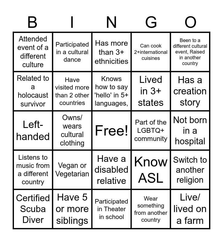 This bingo card has a free space and 41 words: Consider yourself a Yogi, Left-handed, Born in another country, Have visited more than 2 other countries, Have 5 or more siblings, Have a disabled relative, Knows how to say 'hello' in 5+ languages,, Knows 2+ languages fluently, Been to a different cultural event, Raised in another country, Listens to music from a different country, Owns/ wears cultural clothing, Can cook 2+international cuisines, Live/ lived on a farm, Not born in a hospital, Part of the LGBTQ+ community, Vegan or Vegetarian, Participates in Hunting, Attended event of a different culture, Relocated because of a disaster, Has more than 3+ ethnicities, Switch to another religion, Is first generation immigrant, Participated in Theater in school, Lived in 3+ states, Military experience, Celebrate Eid al-Fitr, Ramadan or Eid al-Adha, Wear something from another country, Has traced linage or heritage back 4+ generations, Has a creation story, Experienced racism or micro-aggression, Can play a cultural musical instrument, Participated in a cultural dance, Certified Scuba Diver, Raised by grandparents, Know ASL, Related to a holocaust survivor, Celebrate Kwanzaa, Has experienced stereotyping, Was home schooled, Natural Redhead and Know a Chinese Proverb/ saying.