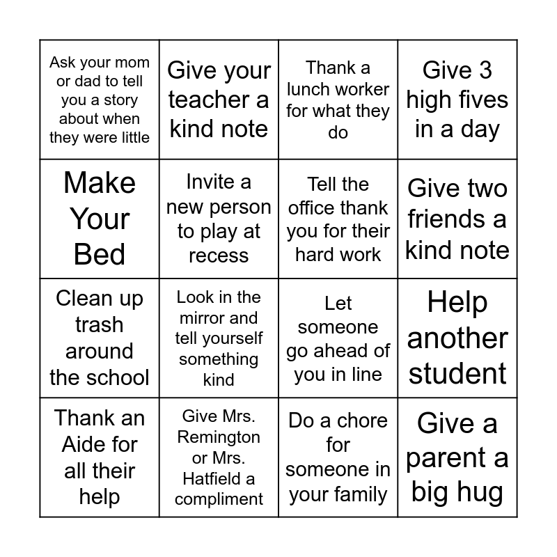 This bingo card has 16 words: Give Mrs. Remington or Mrs. Hatfield a compliment, Help another student, Thank a lunch worker for what they do, Ask your mom or dad to tell you a story about when they were little, Clean up trash around the school, Give your teacher a kind note, Let someone go ahead of you in line, Do a chore for someone in your family, Make Your Bed, Invite a new person to play at recess, Thank an Aide for all their help, Give 3 high fives in a day, Look in the mirror and tell yourself something kind, Give two friends a kind note, Tell the office thank you for their hard work and Give a parent a big hug.