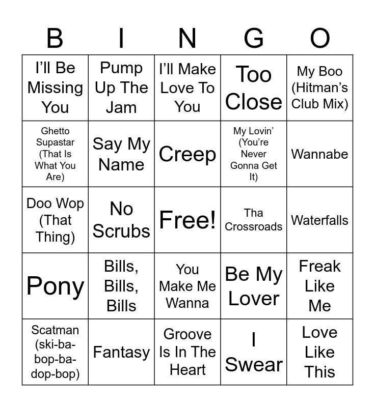 This bingo card has a free space and 40 words: Return Of The Mack, Doo Wop (That Thing), No Diggity, Say My Name, Fantasy, You Make Me Wanna, Creep, This Is How We Do It, My Boo (Hitman’s Club Mix), Pony, No Scrubs, Too Close, Love Like This, Waterfalls, Tha Crossroads, Bills, Bills, Bills, Where My Girls At?, I’ll Be Missing You, No, No, No, I’ll Make Love To You, Freak Like Me, I Swear, My Lovin’ (You’re Never Gonna Get It), Ghetto Supastar (That Is What You Are), Thong Song, Everything Is Everything, Bug A Boo, Bring It All To Me, Get It On Tonite, Whatta Man, Boom, Boom, Boom, Boom!, Scatman (ski-ba-bop-ba-dop-bop), What Is Love, Be My Lover, Wannabe, Groove Is In The Heart, Jump Around, Show Me Love, Pump Up The Jam and The Rhythm Of The Night.