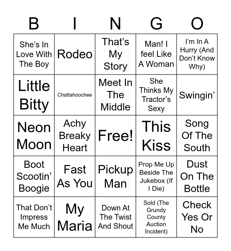 This bingo card has a free space and 40 words: John Deer Greene, Neon Moon, Just To See You Smile, Chattahoochee, My Maria, Pickup Man, Meet In The Middle, Should’ve Been A Cowboy, I’m In A Hurry (And Don’t Know Why), Boot Scootin’ Boogie, Achy Breaky Heart, Man! I feel Like A Woman, Check Yes Or No, Song Of The South, This Kiss, Fast As You, How Forever Feels, She’s In Love With The Boy, Gone Country, That’s My Story, Dust On The Bottle, Sold (The Grundy County Auction Incident), She Thinks My Tractor’s Sexy, Little Bitty, Don’t Rock The Jukebox, The Night The Lights Went Out In Georgia, Small Town Saturday Night, Watermelon Crawl, Friends In Low Places, Brand New Man, Any Man Of Mine, That Don’t Impress Me Much, I Like It, I Love It, Prop Me Up Beside The Jukebox (If I Die), Swingin’, Down At The Twist And Shout, Heads Carolina, Tails California, Summer’s Comin’, Rodeo and It’s A Little Too Late.