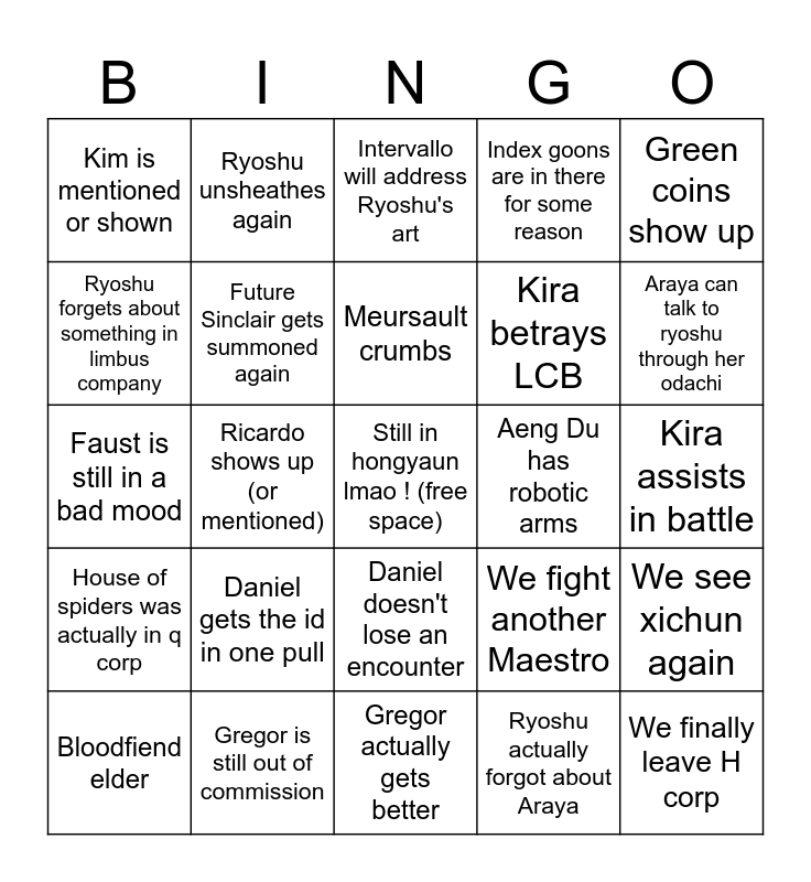This bingo card has a free space and 24 words: Daniel gets the id in one pull, Gregor is still out of commission, Meursault crumbs, Bloodfiend elder, Green coins show up, Kim is mentioned or shown, Ryoshu forgets about something in limbus company, Ryoshu unsheathes again, Aeng Du has robotic arms, Daniel doesn't lose an encounter, Kira betrays LCB, Faust is still in a bad mood, We fight another Maestro, We see xichun again, Future Sinclair gets summoned again, Ryoshu actually forgot about Araya, Kira assists in battle, Intervallo will address Ryoshu's art, Araya can talk to ryoshu through her odachi, Ricardo shows up (or mentioned), We finally leave H corp, House of spiders was actually in q corp, Index goons are in there for some reason and Gregor actually gets better.