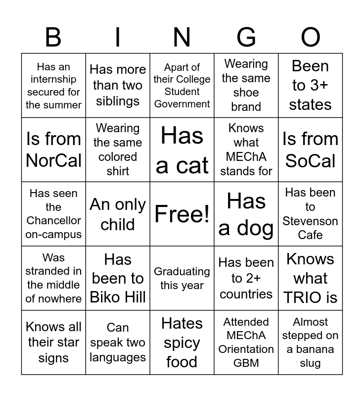 This bingo card has a free space and 24 words: Has been to Biko Hill, Can speak two languages, Has a cat, Knows all their star signs, Been to 3+ states, Has an internship secured for the summer, Is from NorCal, Has more than two siblings, Has a dog, Graduating this year, Knows what MEChA stands for, Has seen the Chancellor on-campus, Has been to 2+ countries, Knows what TRIO is, Wearing the same colored shirt, Attended MEChA Orientation GBM, Has been to Stevenson Cafe, Apart of their College Student Government, Is from SoCal, An only child, Almost stepped on a banana slug, Was stranded in the middle of nowhere, Wearing the same shoe brand and Hates spicy food.
