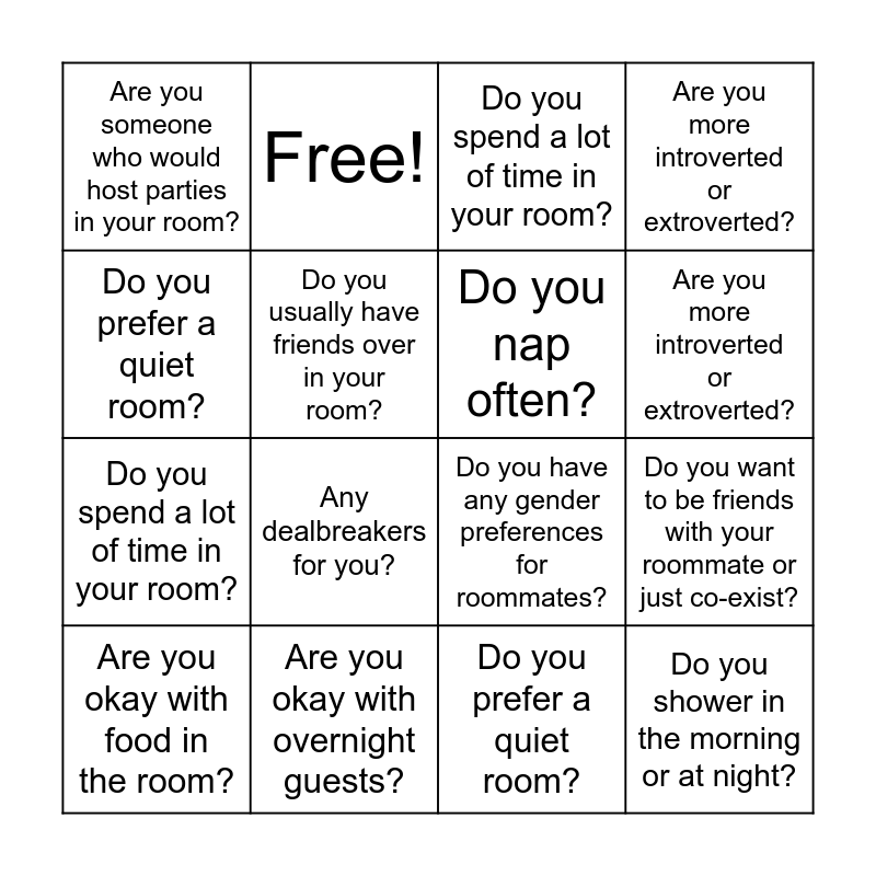 This bingo card has 32 words: How many roommates are you looking for?, Do you have any gender preferences for roommates?, Do you want to be friends with your roommate or just co-exist?, What time do you usually go to bed / wake up?, Do you shower in the morning or at night?, Do you nap often?, Do you prefer a quiet room?, How clean do you like your space? (1–5 scale), Free!, Are you okay with food in the room?, Are you more introverted or extroverted?, Do you spend a lot of time in your room?, Do you usually have friends over in your room?, Are you someone who would host parties in your room?, Are you okay with overnight guests?, How do you usually handle conflict?, How many roommates are you looking for?, Do you have any gender preferences for roommates?, Do you want to be friends with your roommate or just co-exist?, What time do you usually go to bed / wake up?, Do you shower in the morning or at night?, Do you nap often?, Do you prefer a quiet room?, How clean do you like your space? (1–5 scale), Are you okay with food in the room?, Are you more introverted or extroverted?, Do you spend a lot of time in your room?, Do you usually have friends over in your room?, Are you someone who would host parties in your room?, Are you okay with overnight guests?, How do you usually handle conflict? and Any dealbreakers for you?.