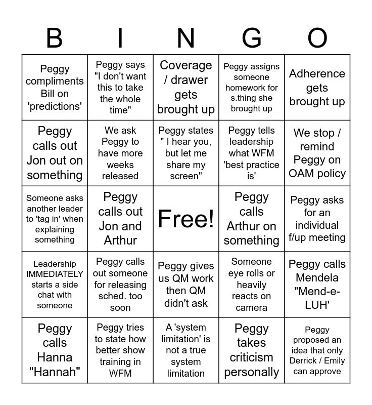 This bingo card has a free space and 24 words: Peggy calls out someone for releasing sched. too soon, Peggy tries to state how better show training in WFM, Peggy states " I hear you, but let me share my screen", Peggy calls Hanna "Hannah", Adherence gets brought up, Peggy compliments Bill on 'predictions', Peggy calls out Jon out on something, Peggy says "I don't want this to take the whole time", Peggy calls Arthur on something, Peggy gives us QM work then QM didn't ask, Peggy tells leadership what WFM 'best practice is', Someone asks another leader to 'tag in' when explaining something, Someone eye rolls or heavily reacts on camera, Peggy calls Mendela "Mend-e-LUH', We ask Peggy to have more weeks released, Peggy takes criticism personally, Peggy asks for an individual f/up meeting, Coverage / drawer gets brought up, We stop / remind Peggy on OAM policy, Peggy calls out Jon and Arthur, Peggy proposed an idea that only Derrick / Emily can approve, Leadership IMMEDIATELY starts a side chat with someone, Peggy assigns someone homework for s.thing she brought up and A 'system limitation' is not a true system limitation.
