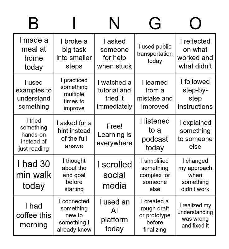 This bingo card has a free space and 24 words: I thought about the end goal before starting, I connected something new to something I already knew, I watched a tutorial and tried it immediately, I had coffee this morning, I reflected on what worked and what didn’t, I made a meal at home today, I used examples to understand something, I broke a big task into smaller steps, I listened to a podcast today, I scrolled social media, I learned from a mistake and improved, I tried something hands-on instead of just reading, I simplified something complex for someone else, I changed my approach when something didn’t work, I practiced something multiple times to improve, I created a rough draft or prototype before finalizing, I explained something to someone else, I asked someone for help when stuck, I followed step-by-step instructions, I asked for a hint instead of the full answe, I realized my understanding was wrong and fixed it, I had 30 min walk today, I used public transportation today and I used an AI platform today.