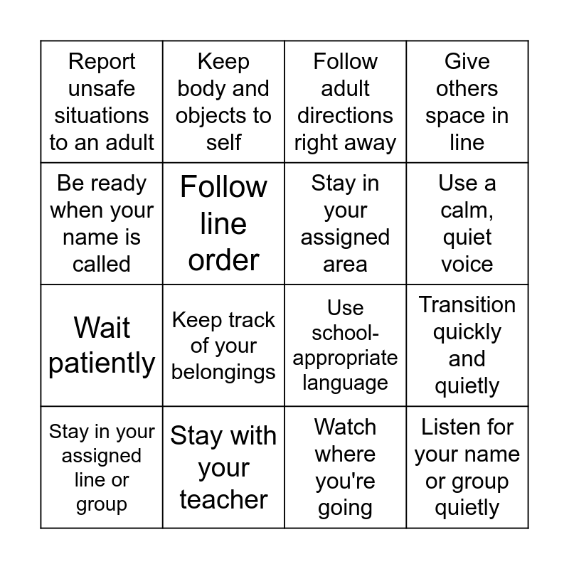 This bingo card has 21 words: Stay with your teacher, Walk at all times, Keep body and objects to self, Keep backpacks and materials with you, Watch where you're going, Stay in your assigned area, Report unsafe situations to an adult, Follow adult directions right away, Use school-appropriate language, Use a calm, quiet voice, Wait patiently, Give others space in line, Listen for your name or group quietly, Be kind to others while waiting, Follow line order, Check out with your teacher, Stay in your assigned line or group, Keep track of your belongings, Be ready when your name is called, Transition quickly and quietly and Go directly to your bus or car.