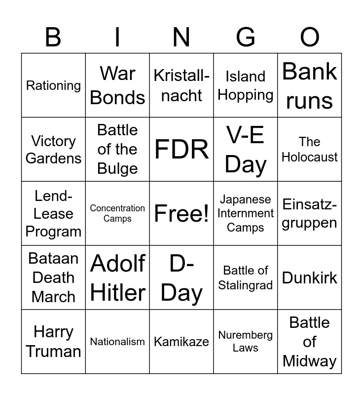 This bingo card has a free space and 24 words: Adolf Hitler, Nationalism, FDR, Harry Truman, Bank runs, Rationing, Victory Gardens, War Bonds, Japanese Internment Camps, D- Day, V-E Day, Lend-Lease Program, Battle of Stalingrad, Dunkirk, Battle of the Bulge, Nuremberg Laws, Einsatz-gruppen, Kristall-nacht, The Holocaust, Concentration Camps, Battle of Midway, Bataan Death March, Island Hopping and Kamikaze.