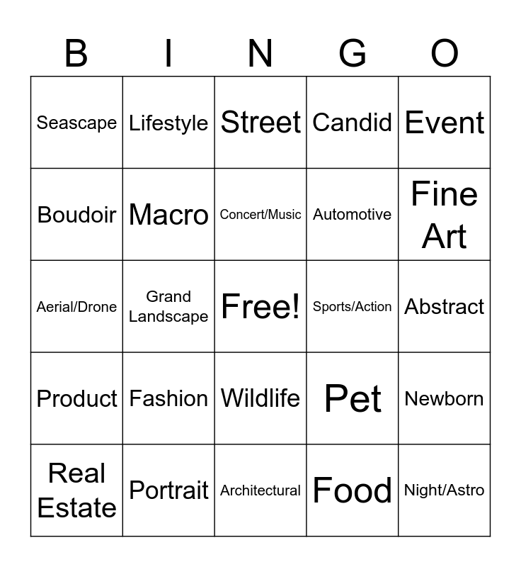 This bingo card has a free space and 30 words: Portrait, Environmental Portrait, Grand Landscape, Small Scene, Seascape, Street, Macro, Wildlife, Sports/Action, Architectural, Abstract, Night/Astro, Food, Documentary, Fine Art, Still Life, Pet, Product, Fashion, Event, Aerial/Drone, Underwater, Lifestyle, Automotive, Boudoir, Candid, Newborn, Real Estate, Concert/Music and Photojournalism.