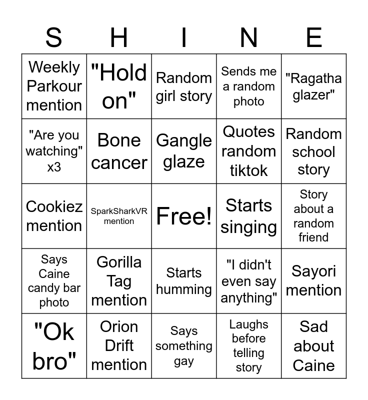 This bingo card has a free space and 24 words: Gorilla Tag mention, Orion Drift mention, Gangle glaze, "Ok bro", "Ragatha glazer", Weekly Parkour mention, "Are you watching" x3, "Hold on", Starts singing, Starts humming, Quotes random tiktok, Cookiez mention, "I didn't even say anything", Sayori mention, Bone cancer, Laughs before telling story, Story about a random friend, Random girl story, Random school story, SparkSharkVR mention, Sad about Caine, Says Caine candy bar photo, Sends me a random photo and Says something gay.
