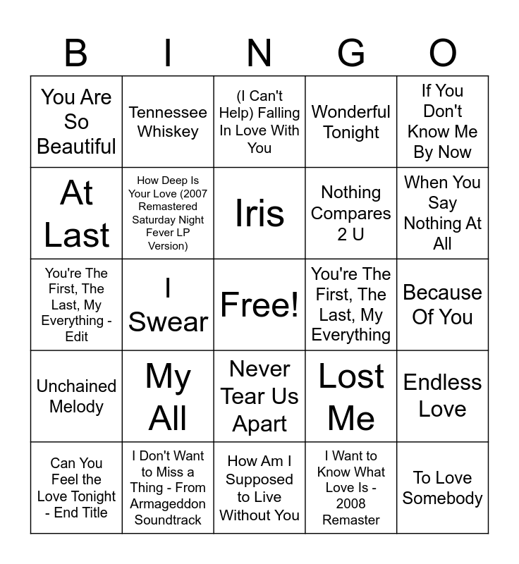 This bingo card has a free space and 61 words: Song, I Don't Want to Miss a Thing - From Armageddon Soundtrack, More Than Words, Unchained Melody, I Want to Know What Love Is - 2008 Remaster, I Will Always Love You, How Deep Is Your Love (2007 Remastered Saturday Night Fever LP Version), (Everything I Do) I Do It For You, Nothing Compares 2 U, I Just Called To Say I Love You, Wonderful Tonight, Because You Loved Me, At Last, Every Breath You Take - Remastered 2003, Total Eclipse of the Heart, You Are So Beautiful, To Love Somebody, If You Don't Know Me By Now, I'll Stand by You, Iris, You're The First, The Last, My Everything, (I Can't Help) Falling In Love With You, Can You Feel the Love Tonight - End Title, Endless Love, a thousand years, I Just Can't Stop Loving You (feat. Siedah Garrett), The Power of Love, You're Still The One, When You Say Nothing At All, (What A) Wonderful World, Take My Breath Away, How Sweet It Is (To Be Loved by You), Only You (And You Alone), Have I Told You Lately - 2008 Remaster, Tennessee Whiskey, Say You Won't Let Go, Truly Madly Deeply, I Swear, How Do I Live, You're The First, The Last, My Everything - Edit, Let Me Love You, My All, Because Of You, I Wanna Know, Lost Me, Easy Lover, True - Single Edit, All Night Long - Single Version, Right Here Waiting, Never Tear Us Apart, How Am I Supposed to Live Without You, Without You, I Will Always Love You, All My Life - Radio Edit, End Of The Road, I Knew I Loved You, It's All Coming Back to Me Now - Radio Edit 1, Every Time I Close My Eyes (with Kenny G), If I Ever Fall In Love, Everybody Hurts and Angel of Mine.