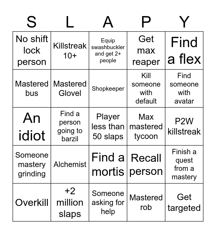 This bingo card has a free space and 24 words: Overkill, Alchemist, Shopkeeper, Mastered rob, Find a flex, No shift lock person, Killstreak 10+, Equip swashbuckler and get 2+ people, Max mastered tycoon, P2W killstreak, An idiot, Mastered Glovel, Recall person, Finish a quest from a mastery, Mastered bus, +2 million slaps, Someone asking for help, Get max reaper, Find someone with avatar, Someone mastery grinding, Find a person going to barzil, Find a mortis, Kill someone with default and Get targeted.