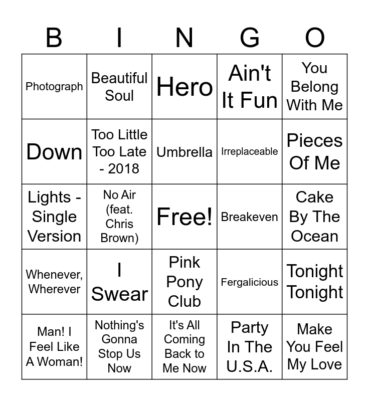 This bingo card has a free space and 51 words: Song, Make You Feel My Love, How Do I Live, It's All Coming Back to Me Now, I Swear, Love Story, Beautiful Soul, Ridin' Solo, Down, Airplanes (feat. Hayley Williams of Paramore), Too Little Too Late - 2018, Ain't It Fun, Tonight Tonight, Fergalicious, Pop, DONTTRUSTME, Umbrella, Breakeven, Wanted, You Belong With Me, No Air (feat. Chris Brown), Party In The U.S.A., Photograph, Irreplaceable, The Stroke - Remastered 2010, Call Me Maybe, Pieces Of Me, Shake It, Man! I Feel Like A Woman!, Hero, Kiss from a Rose, Cowboy Take Me Away, What Is Love - 7 Mix, No Scrubs, Sorry Not Sorry, Nothing's Gonna Stop Us Now, Sweet Dreams (Are Made of This) - 2005 Remaster, Ocean Avenue, IDGAF, Closer, Cake By The Ocean, Whenever, Wherever, I'll Make a Man Out of You, Let It Go - From Frozen /Soundtrack Version, Check Yes, Juliet, Bad At Love, Lights - Single Version, Ice Box, Big Girls Don't Cry (Personal), Pink Pony Club and Espresso.
