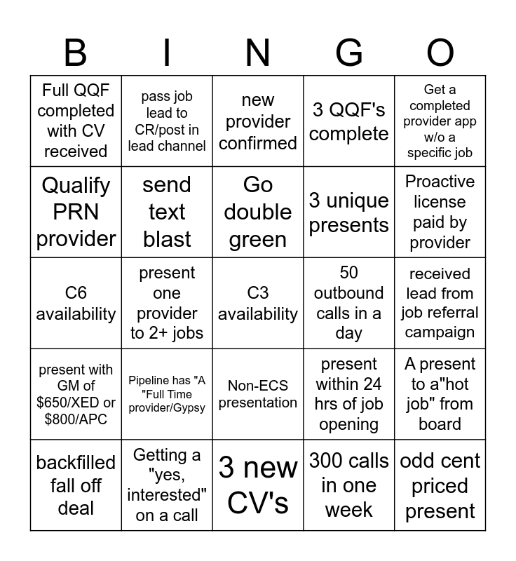 This bingo card has 25 words: Pipeline has "A "Full Time provider/Gypsy, 3 new CV's, Go double green, backfilled fall off deal, Get a completed provider app w/o a specific job, Full QQF completed with CV received, Qualify PRN provider, pass job lead to CR/post in lead channel, 50 outbound calls in a day, Non-ECS presentation, 3 unique presents, C6 availability, present within 24 hrs of job opening, A present to a"hot job" from board, send text blast, odd cent priced present, received lead from job referral campaign, new provider confirmed, Proactive license paid by provider, present one provider to 2+ jobs, C3 availability, Getting a "yes, interested" on a call, present with GM of $650/XED or $800/APC, 3 QQF's complete and 300 calls in one week.