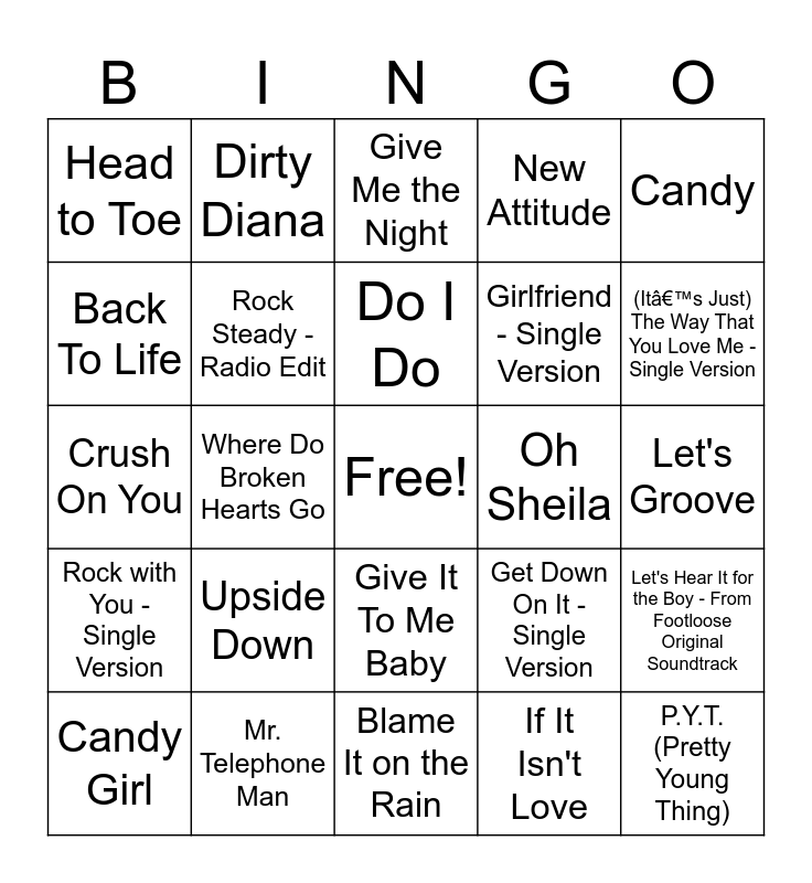 This bingo card has a free space and 60 words: Song, Mr. Telephone Man, How Will I Know, Rock with You - Single Version, If It Isn't Love, Let It Whip, Rock Steady - Radio Edit, In My House - Single Version, Girlfriend - Single Version, The Way You Love Me, New Attitude, Two To Make It Right, Back To Life, Good Life, My Prerogative, Head to Toe, P.Y.T. (Pretty Young Thing), Candy, Juicy Fruit - Single Version, Do I Do, Oh Sheila, Give Me the Night, Candy Girl, Let's Hear It for the Boy - From Footloose Original Soundtrack, Get Outta My Dreams, Get into My Car, Forever Your Girl, Straight Up, Opposites Attract - 7 Edit, (It’s Just) The Way That You Love Me - Single Version, Cold Hearted - 7 Edit, Every Little Step, Looking For A New Love - Radio Edit, Don't You Want Me, What Have You Done For Me Lately, Dirty Diana, When Doves Cry, I Wanna Be Rich - Radio Mix, Where Do Broken Hearts Go, Rhythm Of The Night, Crush On You, I Just Called To Say I Love You, Upside Down, Let's Groove, All Night Long (All Night), Get Down On It - Single Version, Here and Now, Smooth Operator - Single Version, Party All the Time, You Dropped A Bomb On Me - Single Version, Give It To Me Baby, Blame It on the Rain, Can You Stand The Rain, I'm Still In Love With You, Super Freak, Greatest Love of All, What's Love Got to Do with It - Extended 12 Remix; 2015 Remaster, All Cried Out (with Full Force), Girl You Know It's True - US Single Version, Hello and Stairway to Heaven - Remaster.