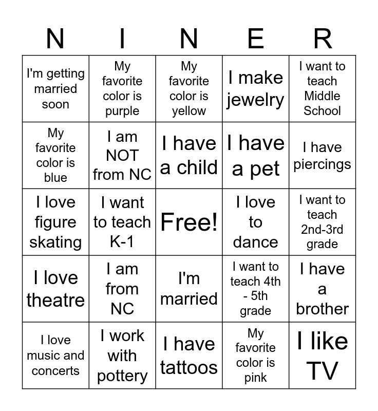 This bingo card has a free space and 28 words: I have a brother, I have a sister, I have a pet, My favorite color is pink, My favorite color is blue, My favorite color is yellow, My favorite color is purple, I love theatre, I love to dance, I love music and concerts, I love figure skating, I make jewelry, I work with pottery, I have tattoos, I have piercings, I have a job, I am from NC, I am NOT from NC, I have a child, I'm married, I'm getting married soon, I like sports, I like TV, I want to teach K-1, I want to teach 2nd-3rd grade, I want to teach 4th - 5th grade, I want to teach Middle School and I want to teach high school.