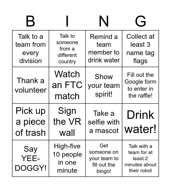 This bingo card has 20 words: Drink water!, Collect pins from 10 different teams, Remind a team member to drink water, Join in on a chant, Say YEE-DOGGY!, Thank a volunteer, High-five 10 people in one minute, Talk to a team from every division, Pick up a piece of trash, Talk to someone from a different country, Sign the VR wall, Take a selfie with a mascot, Watch an FTC match, Talk with a team for at least 2 minutes about their robot, Show your team spirit!, Visit the Innovation Fair!, Fill out the Google form to enter in the raffle!, Collect at least 3 name tag flags, Get someone on your team to fill out the bingo! and Free space.