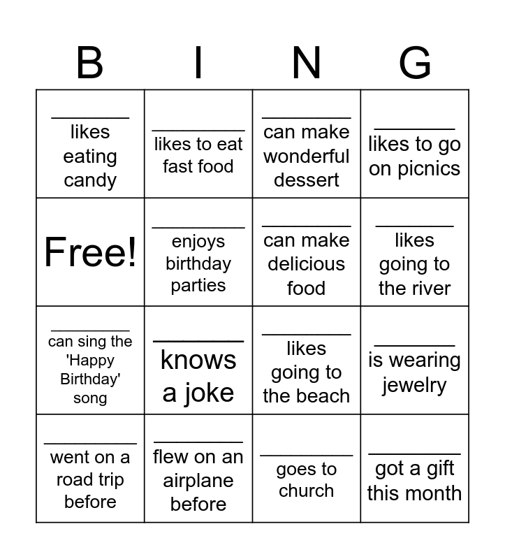 This bingo card has 16 words: ________ flew on an airplane before, _______ is wearing jewelry, ________ can make wonderful dessert, _______ likes eating candy, _________ can sing the 'Happy Birthday' song, _________ likes to eat fast food, ________ likes going to the beach, _________ goes to church, Free!, _________ enjoys birthday parties, _________ went on a road trip before, _______ likes to go on picnics, ______ knows a joke, _______ likes going to the river, ________ can make delicious food and ________ got a gift this month.