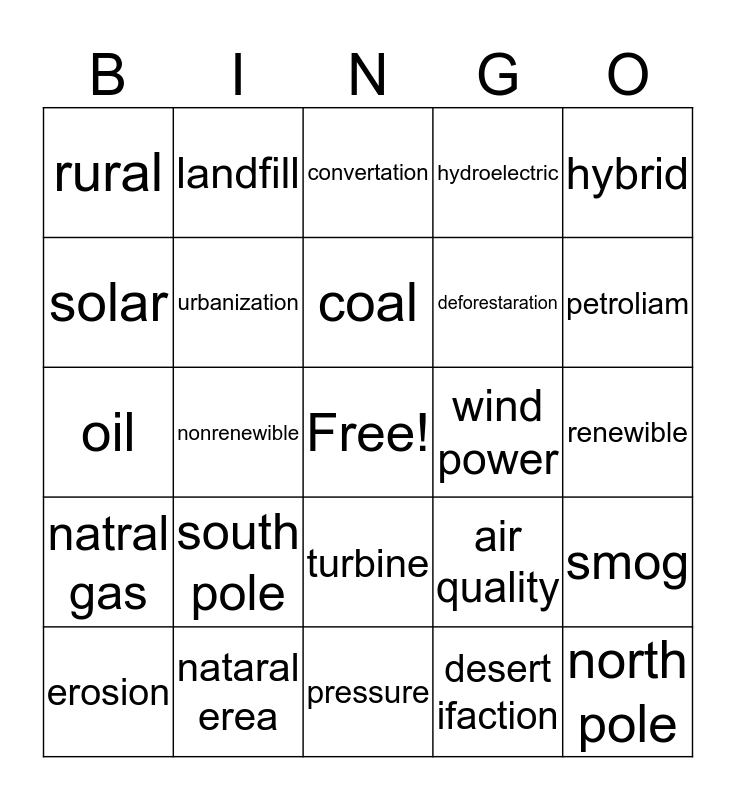 This bingo card has a free space and 24 words: south pole, nataral erea, coal, erosion, hybrid, rural, solar, landfill, wind power, turbine, deforestaration, oil, air quality, smog, urbanization, desert ifaction, renewible, convertation, petroliam, nonrenewible, north pole, natral gas, hydroelectric and pressure.