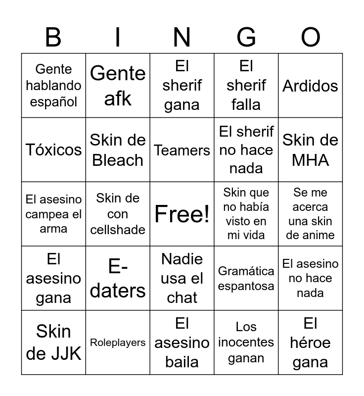 This bingo card has a free space and 24 words: E-daters, Roleplayers, Teamers, Skin de JJK, Ardidos, Gente hablando español, Tóxicos, Gente afk, Skin que no había visto en mi vida, Nadie usa el chat, El sherif no hace nada, El asesino campea el arma, Gramática espantosa, El asesino no hace nada, Skin de Bleach, Los inocentes ganan, Se me acerca una skin de anime, El sherif gana, Skin de MHA, Skin de con cellshade, El héroe gana, El asesino gana, El sherif falla and El asesino baila.