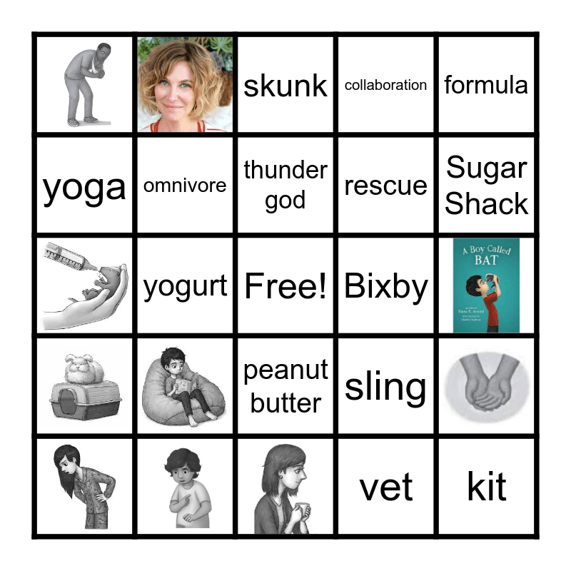 This bingo card has 11 images, a free space and 18 words: Dr. Dragoo, yogurt, Mr. Grayson, skunk, omnivore, Bixby, kit, vet, Sugar Shack, peanut butter, formula, sling, Dad, rescue, yoga, collaboration, thunder god and enclosure.
