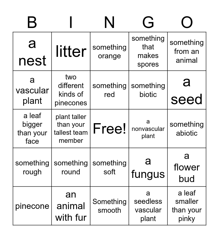 This bingo card has a free space and 31 words: Something smooth, leaf with rough edges, plant taller than your tallest team member, an insect, a nest, something orange, two different kinds of pinecones, a fungus, a nonvascular plant, a seedless vascular plant, something abiotic, a leaf smaller than your pinky, a blooming flower, an animal with feathers, a seed, something yellow, a flower bud, something round, something rough, something soft, something from an animal, spider web, pinecone, litter, something biotic, a vascular plant, something that makes spores, a leaf bigger than your face, an animal with fur, something red and something blue.