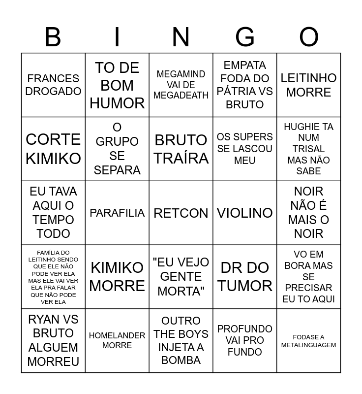 This bingo card has a free space and 24 words: KIMIKO MORRE, HOMELANDER MORRE, BRUTO TRAÍRA, RYAN VS BRUTO ALGUEM MORREU, LEITINHO MORRE, FRANCES DROGADO, CORTE KIMIKO, TO DE BOM HUMOR, VIOLINO, "EU VEJO GENTE MORTA", OS SUPERS SE LASCOU MEU, EU TAVA AQUI O TEMPO TODO, DR DO TUMOR, VO EM BORA MAS SE PRECISAR EU TO AQUI, O GRUPO SE SEPARA, PROFUNDO VAI PRO FUNDO, NOIR NÃO É MAIS O NOIR, MEGAMIND VAI DE MEGADEATH, HUGHIE TA NUM TRISAL MAS NÃO SABE, PARAFILIA, FODASE A METALINGUAGEM, FAMÍLIA DO LEITINHO SENDO QUE ELE NÃO PODE VER ELA MAS ELE VAI VER ELA PRA FALAR QUE NÃO PODE VER ELA, EMPATA FODA DO PÁTRIA VS BRUTO and OUTRO THE BOYS INJETA A BOMBA.