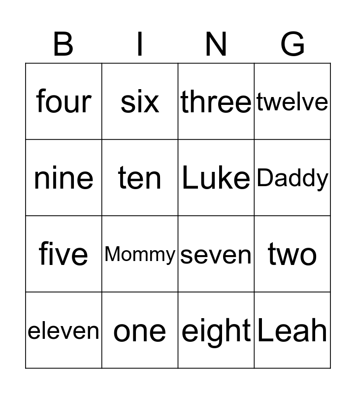 This bingo card has 16 words: one, two, three, four, five, six, seven, eight, nine, ten, eleven, twelve, Mommy, Daddy, Luke and Leah.