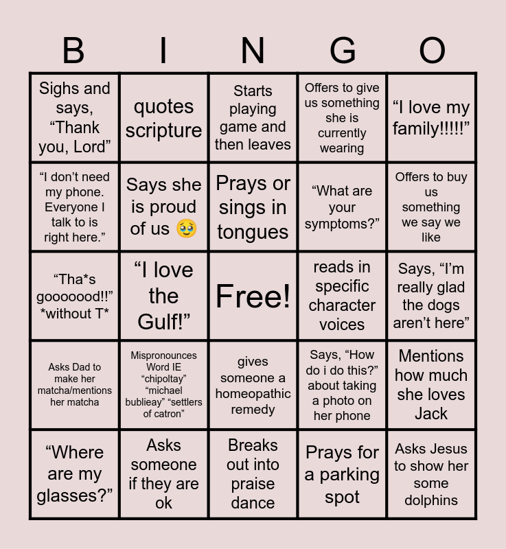 This bingo card has a free space and 25 words: Mispronounces Word IE “chipoltay” “michael bublieay” “settlers of catron”, Breaks out into praise dance, Prays or sings in tongues, “Where are my glasses?”, “I love my family!!!!!”, Sighs and says, “Thank you, Lord”, “I don’t need my phone. Everyone I talk to is right here.”, quotes scripture, reads in specific character voices, gives someone a homeopathic remedy, “What are your symptoms?”, “Tha*s gooooood!!” *without T*, Says, “How do i do this?” about taking a photo on her phone, Mentions how much she loves Jack, Says she is proud of us 🥹, misses her dogs, Says, “I’m really glad the dogs aren’t here”, Starts playing game and then leaves, Offers to buy us something we say we like, “I love the Gulf!”, Asks Jesus to show her some dolphins, Asks someone if they are ok, Asks Dad to make her matcha/mentions her matcha, Offers to give us something she is currently wearing and Prays for a parking spot.