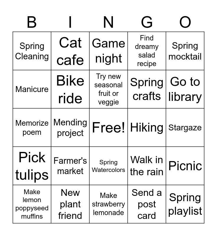 This bingo card has a free space and 24 words: Farmer's market, New plant friend, Try new seasonal fruit or veggie, Make lemon poppyseed muffins, Spring mocktail, Spring Cleaning, Manicure, Cat cafe, Hiking, Spring Watercolors, Spring crafts, Memorize poem, Walk in the rain, Picnic, Bike ride, Send a post card, Stargaze, Game night, Go to library, Mending project, Spring playlist, Pick tulips, Find dreamy salad recipe and Make strawberry lemonade.