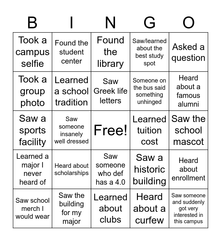 This bingo card has a free space and 24 words: Saw school merch I would wear, Heard about scholarships, Saw Greek life letters, Heard about a curfew, Asked a question, Took a campus selfie, Found the student center, Found the library, Learned tuition cost, Saw the school mascot, Saw a sports facility, Learned a school tradition, Saw a historic building, Heard about enrollment, Took a group photo, Saw the building for my major, Learned about clubs, Saw/learned about the best study spot, Heard about a famous alumni, Learned a major I never heard of, Saw someone insanely well dressed, Saw someone who def has a 4.0, Someone on the bus said something unhinged and Saw someone and suddenly got very interested in this campus.