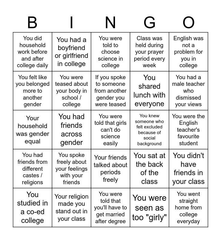 This bingo card has a free space and 29 words: You studied in a co-ed college, Your classroom seating was gender segregated, You had friends across gender, You spoke freely in class, You did household work before and after college daily, You were told to choose science in college, You were teased about your body in school / college, You spoke freely about your feelings with your friends, You knew someone who felt excluded because of social background, Your religion made you stand out in your class, You were the English teacher's favourite student, You went straight home from college everyday, You were told that you'll have to get married after degree, You were seen as too "girly", You had a male teacher who dismissed your views, Your teachers talked about periods freely in class, Your friends talked about periods freely, You had friends from different castes / religions, English was not a problem for you in college, Your household was gender equal, You sat at the back of the class, You made fun of women teachers more than men teachers, You shared lunch with everyone, You felt like you belonged more to another gender, Class was held during your prayer period every week, You had a boyfriend or girlfriend in college, You didn't have friends in your class, If you spoke to someone from another gender you were teased and You had a part time job outside college.