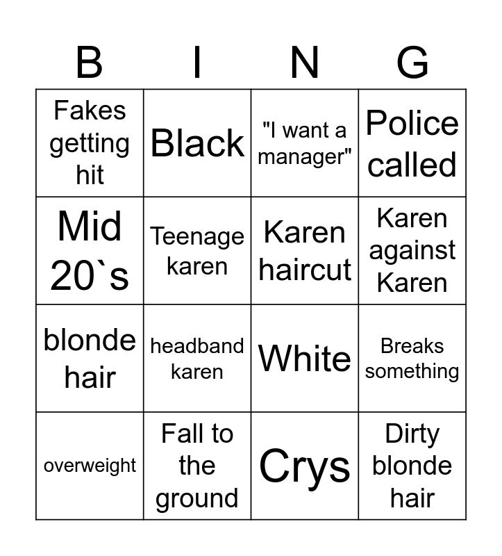 This bingo card has 16 words: Fall to the ground, Breaks something, "I want a manager", Fakes getting hit, blonde hair, Black, White, Crys, Mid 20`s, Teenage karen, overweight, Police called, headband karen, Karen against Karen, Karen haircut and Dirty blonde hair.