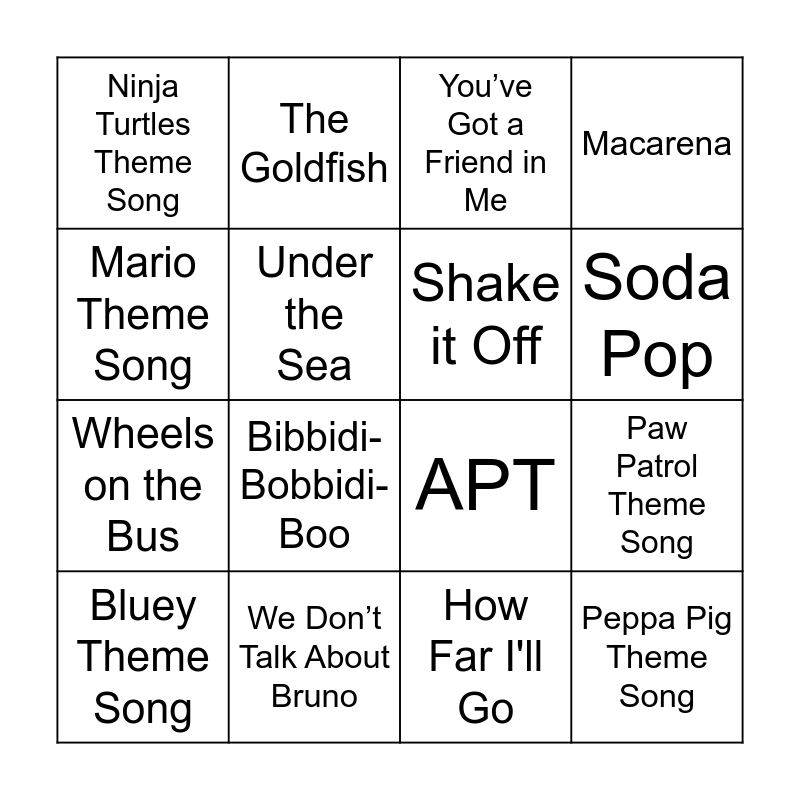 This bingo card has 35 words: Baby Shark, Let it Go, Do You Want to Build a Snowman, Shake it Off, YMCA, Macarena, Under the Sea, Golden, Soda Pop, Chicken Banana, APT, Mario Theme Song, Firework, Pokémon Theme Song, Ninja Turtles Theme Song, We Don’t Talk About Bruno, Who Let the Dogs Out, Paw Patrol Theme Song, Peppa Pig Theme Song, Bluey Theme Song, SpongeBob Square Pants Theme Song, Hakuna Matata, A Whole New World, Be Our Guest, You’ve Got a Friend in Me, Bibbidi-Bobbidi-Boo, Can't Stop the Feeling, Happy, Wheels on the Bus, How Far I'll Go, Opalite, B-I-N-G-O, I'm a Gummy Bear, The Goldfish and Dance Monkey.