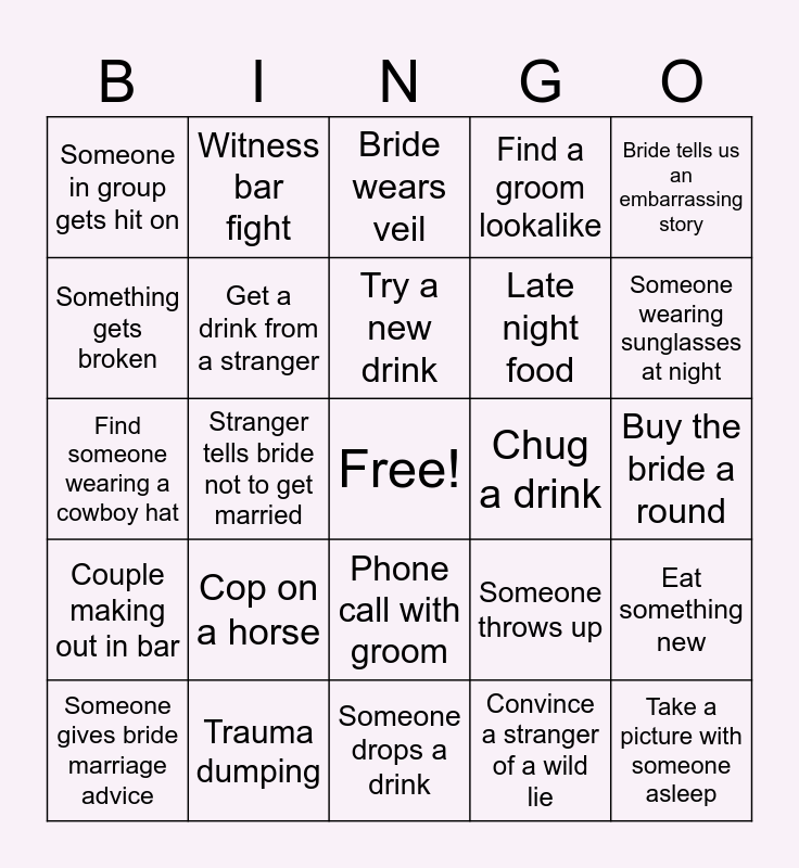 This bingo card has a free space and 44 words: Someone cries, Cop on a horse, Bride gets complimented by a stranger, Convince a stranger of a wild lie, A man wearing a speedo, Spot another Bach party, Get a drink from a stranger, Win a bachelorette game, Find a groom lookalike, Take a picture with someone asleep, Someone in group gets hit on, Trauma dumping, Someone throws up, Buy the bride a round, Someone falls, Group shots, Someone drops a drink, Chug a drink, Get someone’s business card, Find someone wearing a cowboy hat, Witness bar fight, Phone call with groom, Toast to the bride and groom, Bride tells us an embarrassing story, Get asked for ID, Find someone speaking a different language, Try a new drink, Spot a sea animal, Eat something new, Someone gives bride marriage advice, Bride wears sash, Bride wears veil, Feet hurt, Find a bachelor party, Couple making out in bar, Use the men’s restroom, Take a double shot, Someone loses their voice, Someone wearing sunglasses at night, Something gets broken, Stranger tells bride not to get married, Hot bartender, Late night food and Someone gets cut off.