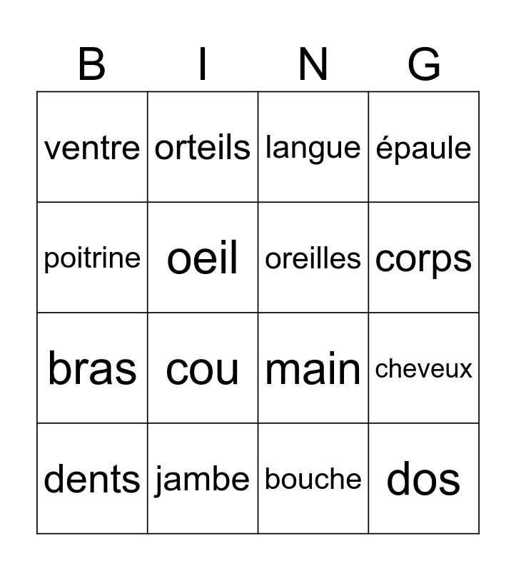 This bingo card has 24 words: yeux, tête, corps, visage, poitrine, ventre, oeil, orteils, jambe, genou, bras, main, pied, doigt, oreilles, nez, bouche, langue, cou, cheveux, dents, dos, épaule and coude.