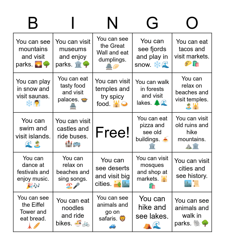 This bingo card has a free space and 33 words: You can hike in the mountains and see lakes. 🍁🏔️, You can see cherry blossoms and visit temples. 🌸🏯, You can visit castles and ride buses. 🏰🚌, You can see animals and go to the beach. 🐨🏖️, You can dance at festivals and enjoy music. 🎉🎶, You can eat tasty food and visit palaces. 🍲🏯, You can eat tacos and visit markets. 🌮🛍️, You can see the Eiffel Tower and eat bread. 🗼🥖, You can visit museums and enjoy parks. 🏛️🌳, You can see pyramids and ride camels. 🏜️🐫, You can visit temples and try spicy food. 🕌🍛, You can see the Great Wall and eat dumplings. 🏯🥟, You can play in the snow and see big cities. ❄️🏙️, You can dance and enjoy beaches. 💃🏖️, You can eat pizza and see old buildings. 🍝🏛️, You can relax on beaches and visit temples. 🏝️🕌, You can eat noodles and ride bikes. 🍜🚲, You can swim and visit islands. 🌊🏝️, You can relax on beaches and sing songs. 🏖️🎤, You can visit mosques and shop at markets. 🕌🛍️, You can see deserts and visit big cities. 🏜️🏙️, You can play soccer and enjoy music. ⚽🎶, You can see mountains and visit parks. 🌄🌳, You can visit old ruins and hike mountains. ⛰️🏛️, You can see animals and go on safaris. 🦁🚙, You can see animals and walk in parks. 🐘🌳, You can see fjords and play in snow. ❄️🌊, You can walk in forests and visit lakes. 🌲🌊, You can play in snow and visit saunas. ❄️🧖♂️, You can visit cities and see history. 🏙️📜, You can see islands and visit beaches. 🏝️🏖️, You can hike and see lakes. ⛺🌊 and You can ride horses and see wide land. 🐎🌄.
