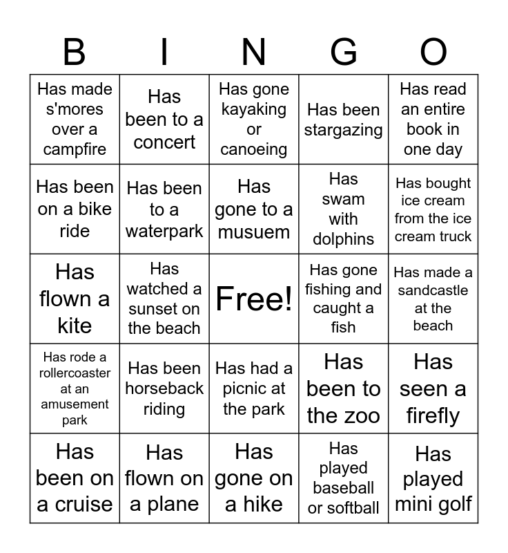 This bingo card has a free space and 29 words: Has been on a cruise, Has seen a bear, Has watched a sunset on the beach, Has traveled outside the country, Has made s'mores over a campfire, Has gone kayaking or canoeing, Has been to a waterpark, Has been horseback riding, Has gone fishing and caught a fish, Has flown on a plane, Has made a sandcastle at the beach, Has played mini golf, Has gone on a hike, Has played baseball or softball, Has bought ice cream from the ice cream truck, Has been to the beach and collected seashells, Has had a picnic at the park, Has rode a rollercoaster at an amusement park, Has read an entire book in one day, Has flown a kite, Has been to the zoo, Has tie-dyed a t-shirt, Has swam with dolphins, Has been on a bike ride, Has been stargazing, Has been to a concert, Has seen a firefly, Has gone to a musuem and Has picked blueberries.