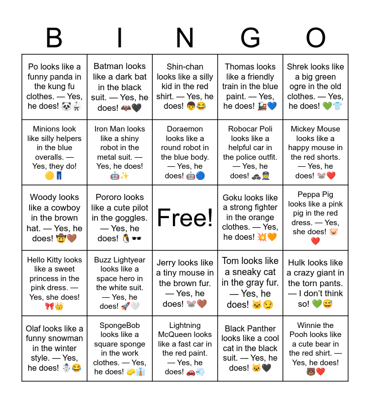 This bingo card has a free space and 33 words: Elsa looks like a queen in the blue dress. โ Yes, she does! ๐โ๏ธ, Spider-Man looks like a busy spider in the red suit. โ Yes, he does! ๐ท๏ธ๐ธ๏ธ, Pororo looks like a cute pilot in the goggles. โ Yes, he does! ๐ง๐ถ๏ธ, Pikachu looks like a happy mouse in the yellow fur. โ Yes, he does! โก๐ญ, Hello Kitty looks like a sweet princess in the pink dress. โ Yes, she does! ๐๐, Iron Man looks like a shiny robot in the metal suit. โ Yes, he does! ๐คโจ, Shrek looks like a big green ogre in the old clothes. โ Yes, he does! ๐๐, Olaf looks like a funny snowman in the winter style. โ Yes, he does! โ๏ธ๐, Batman looks like a dark bat in the black suit. โ Yes, he does! ๐ฆ๐ค, Superman looks like a strong hero in the blue suit. โ Yes, he does! ๐ช๐ต, Doraemon looks like a round robot in the blue body. โ Yes, he does! ๐ค๐ต, Shin-chan looks like a silly kid in the red shirt. โ Yes, he does! ๐ฆ๐, Totoro looks like a big soft bear in the gray fur. โ Yes, he does! ๐ป๐ซ๏ธ, Naruto looks like a fast ninja in the orange outfit. โ Yes, he does! ๐ฅท๐งก, Goku looks like a strong fighter in the orange clothes. โ Yes, he does! ๐ฅ๐งก, Mickey Mouse looks like a happy mouse in the red shorts. โ Yes, he does! ๐ญโค๏ธ, SpongeBob looks like a square sponge in the work clothes. โ Yes, he does! ๐งฝ๐, Woody looks like a cowboy in the brown hat. โ Yes, he does! ๐ค ๐ค, Buzz Lightyear looks like a space hero in the white suit. โ Yes, he does! ๐๐ค, Tom looks like a sneaky cat in the gray fur. โ Yes, he does! ๐ฑ๐, Jerry looks like a tiny mouse in the brown fur. โ Yes, he does! ๐ญ๐ค, Scooby-Doo looks like a scared dog in the collar. โ Yes, he does! ๐ถ๐จ, Po looks like a funny panda in the kung fu clothes. โ Yes, he does! ๐ผ๐ฅ, Peppa Pig looks like a pink pig in the red dress. โ Yes, she does! ๐ทโค๏ธ, Lightning McQueen looks like a fast car in the red paint. โ Yes, he does! ๐๐จ, Winnie the Pooh looks like a cute bear in the red shirt. โ Yes, he does! ๐ปโค๏ธ, Thomas looks like a friendly train in the blue paint. โ Yes, he does! ๐๐, Robocar Poli looks like a helpful car in the police outfit. โ Yes, he does! ๐๐ฎ, Minions look like silly helpers in the blue overalls. โ Yes, they do! ๐ก๐, Hulk looks like a crazy giant in the torn pants. โ I donโt think so! ๐๐ , Captain America looks like a brave soldier in the star suit. โ Yes, he does! โญ๐ก๏ธ, Black Panther looks like a cool cat in the black suit. โ Yes, he does! ๐ฑ๐ค and Wonder Woman looks like a strong queen in the armor. โ Yes, she does! ๐ก๏ธ๐.