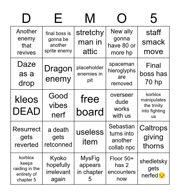 This bingo card has a free space and 24 words: korblox keeps raiding in the entirety of chapter 5, a death gets retconned, placeholder enemies in pit, Floor 50+ has 2 encounters now, staff smack move, Another enemy that revives, final boss is gonna be another sprite enemy, stretchy man in attic, overseer dude works with us, korblox manipulates the trinity into fighting us, kleos DEAD, Dragon enemy, Sebastian turns into another collab npc, Caltrops giving thorns, Daze as a drop, Kyoko hopefully irrelevant again, MysFig appears in chapter 5, New ally gonna have 80 or more hp, Final boss has 70 hp, Resurrect gets reverted, Good vibes nerf, useless item, spaceman hieroglyphs are removed and shedletsky gets nerfed😒.